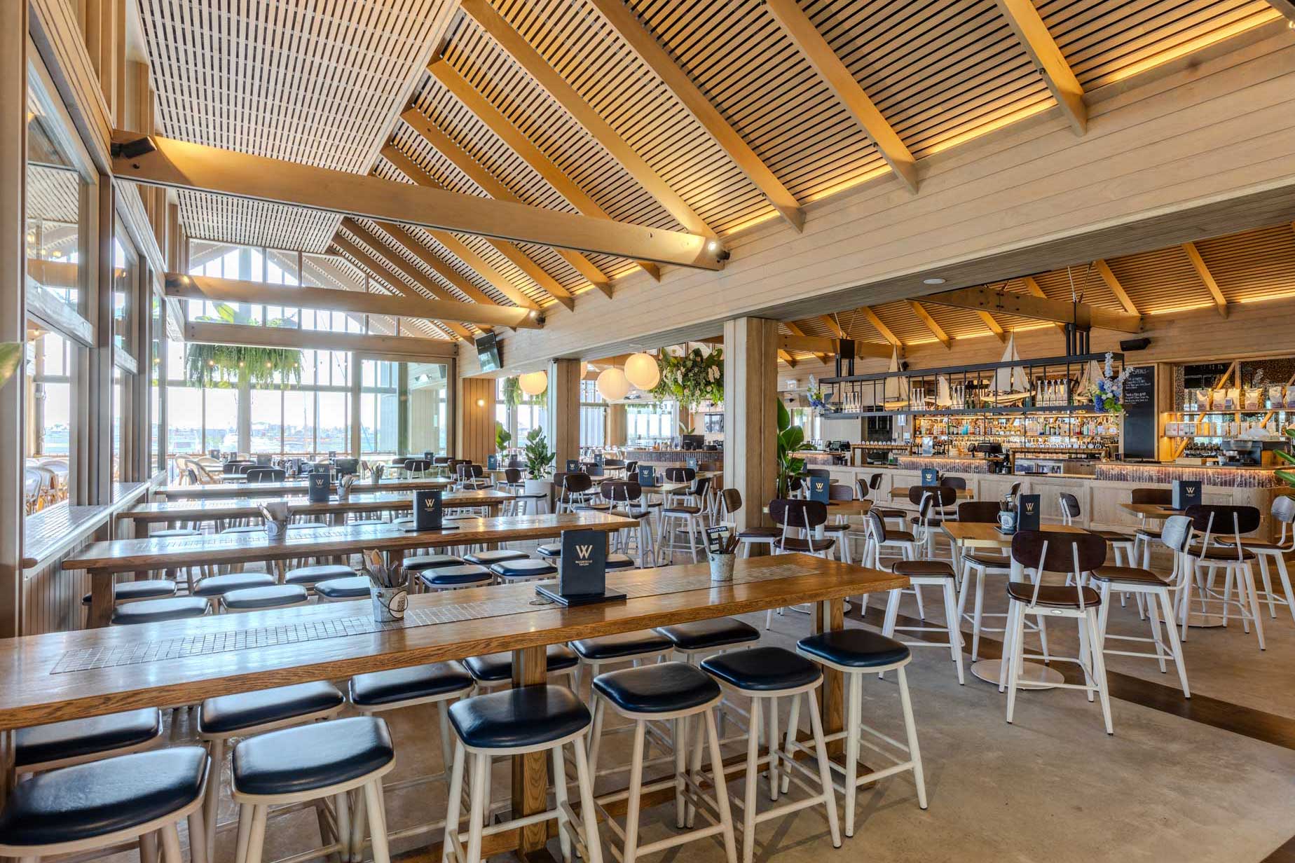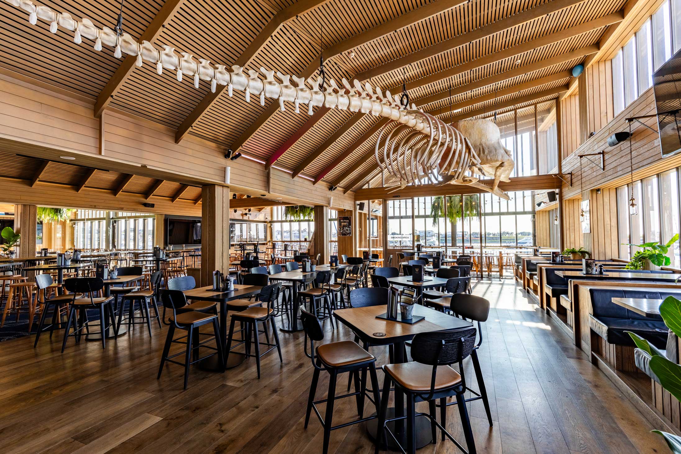 Tucked away at the end of the venue in our sports bar, Whale Cove offers a relaxed and inviting atmosphere with a versatile mix of high and low seating. Its semi-private layout provides a sense of intimacy while remaining connected to the vibrant energy of the venue. With soft lighting, comfortable furnishings, and views across the marina, Whale Cove is a welcoming space to unwind and take in the waterfront surrounds.