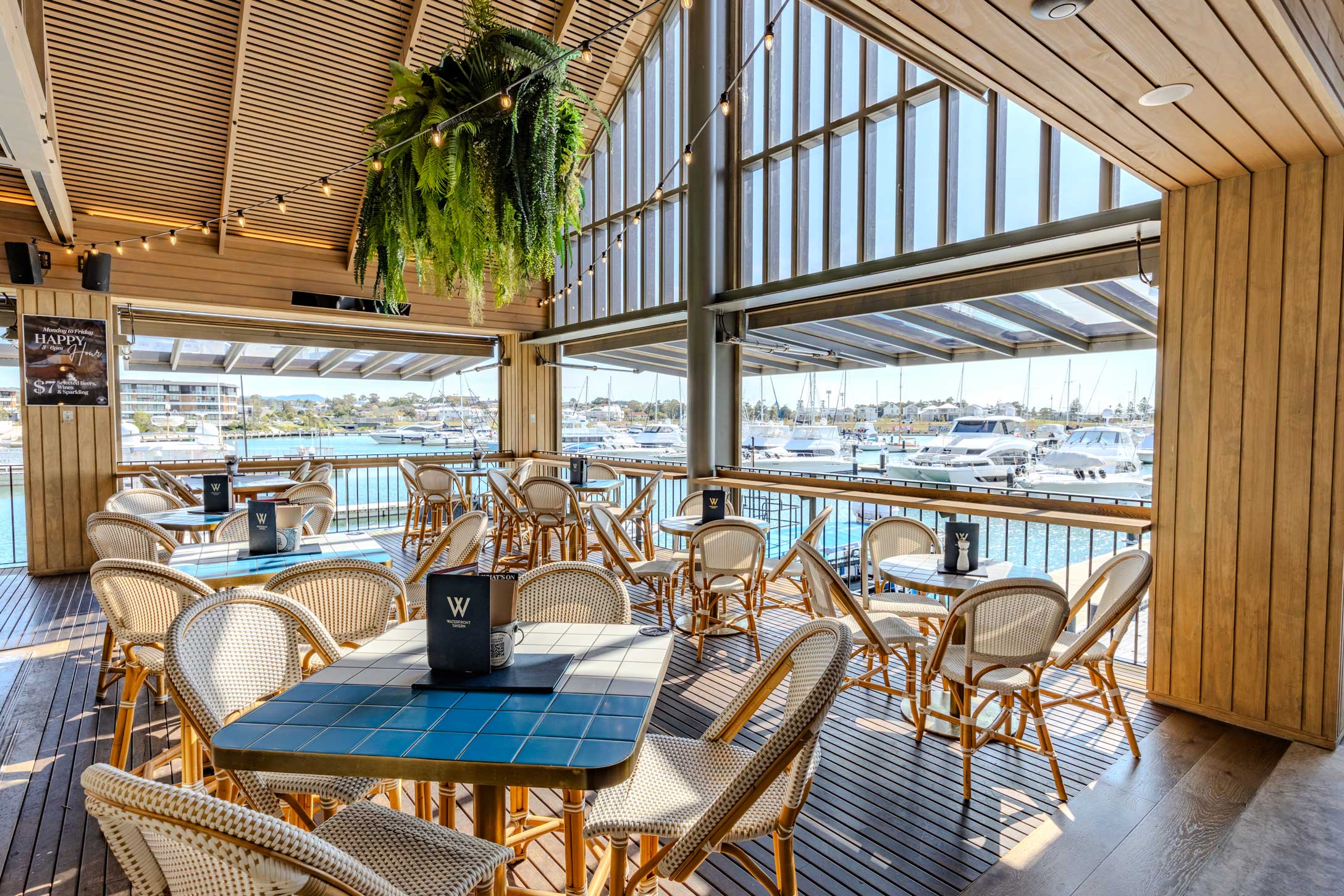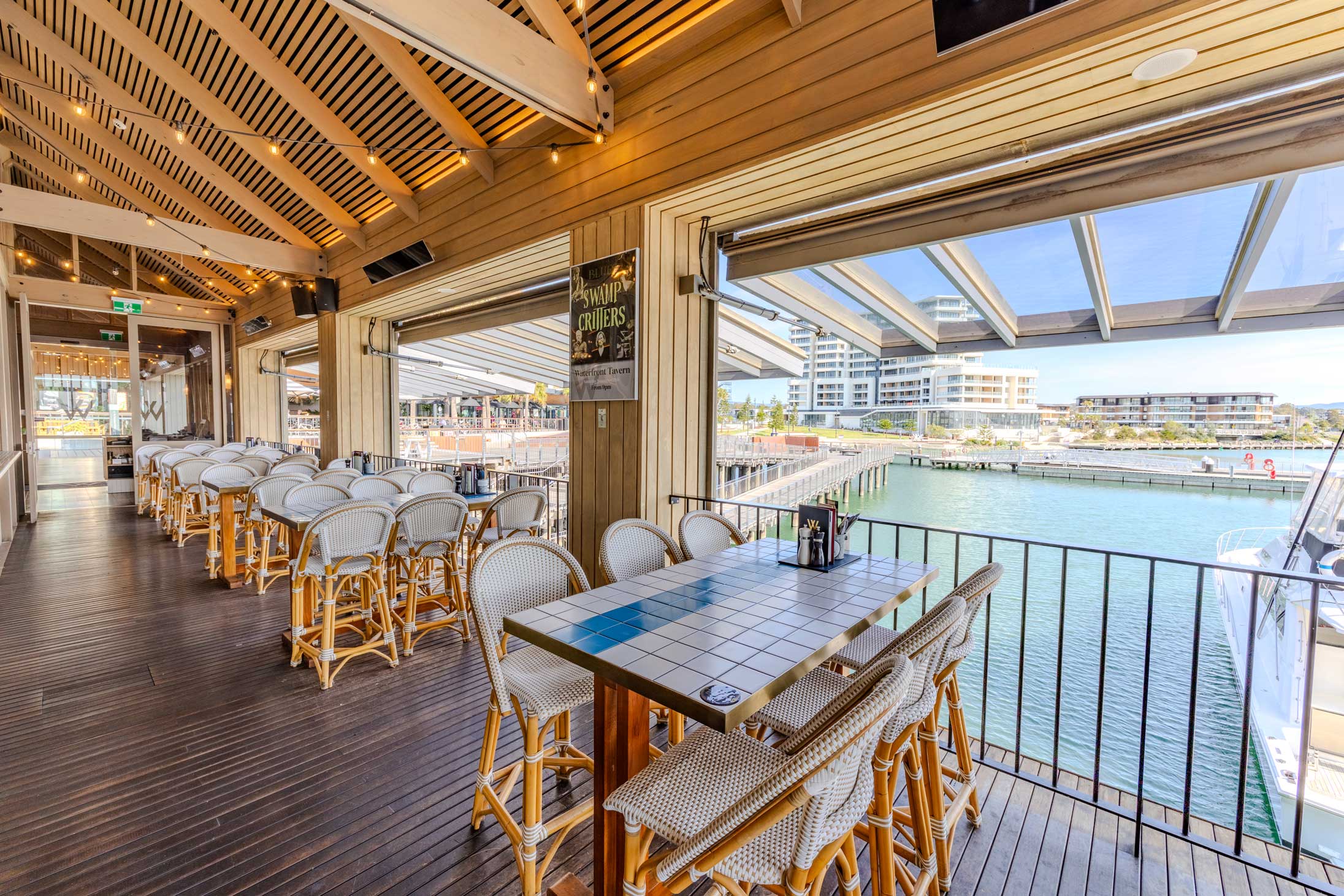 Bask in 180-degree marina views from our exclusive northern corner. With raked ceilings and adjustable gas-lift glass walls, this space is flooded with natural light, creating a bright and inviting atmosphere. Perfect for smaller events, this premium setting is sectioned off from the main deck, offering a sense of exclusivity. High tables and backed stools add to the relaxed yet elevated vibe, making it an ideal choice for intimate gatherings.